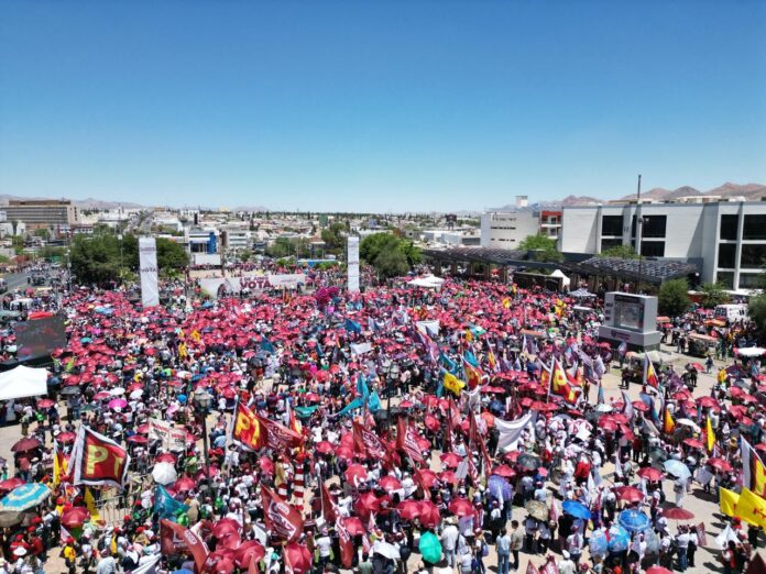 Chihuahua, Chih., a 22 de mayo del 2024.- Un aproximado de 22 mil militantes y simpatizantes de la coalición “Juntos Haremos Historia” que encabeza la alianza del Partido Morena, Partido del Trabajo y Verde Ecologista de México se reunieron para recibir a su candidata a la presidencia de la república, Claudia Sheinbaum Pardo.