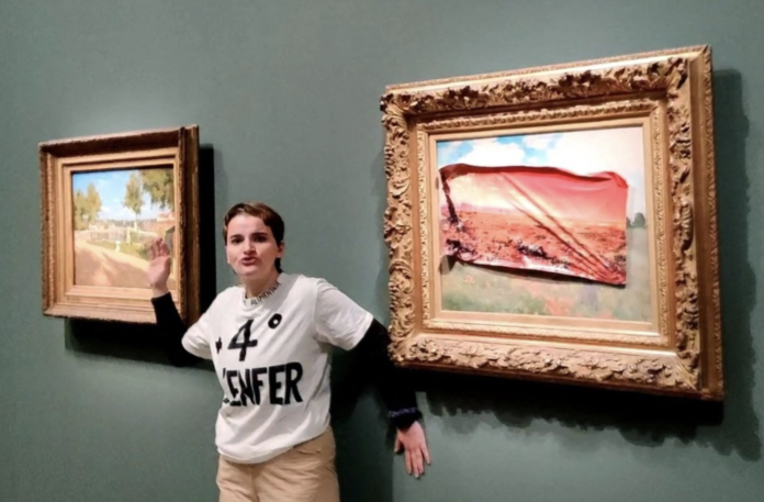 Paris, Francia., a 1 de junio del 2024.- París. Una activista fue detenida el sábado por pegar un cartel adhesivo sobre un cuadro de Monet en el Museo de Orsay de París para dirigir la atención hacia el calentamiento global, indicó a la AFP una fuente policial.