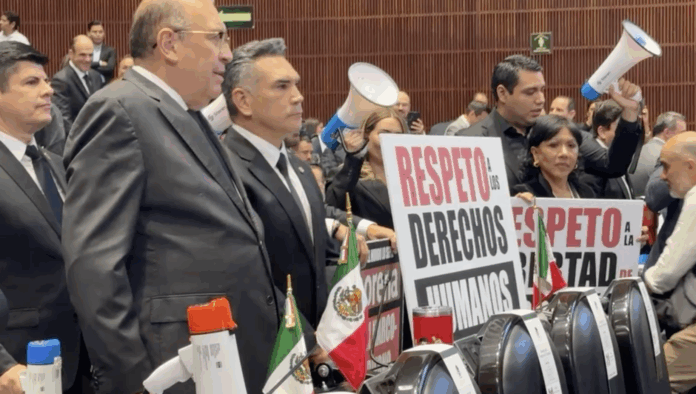 Mientras la petista hablaba, integrantes del grupo parlamentario del PRI alzaron carteles con la leyenda “Respeto a los Derechos Humanos” y con megáfonos intentaron reventar la sesión.