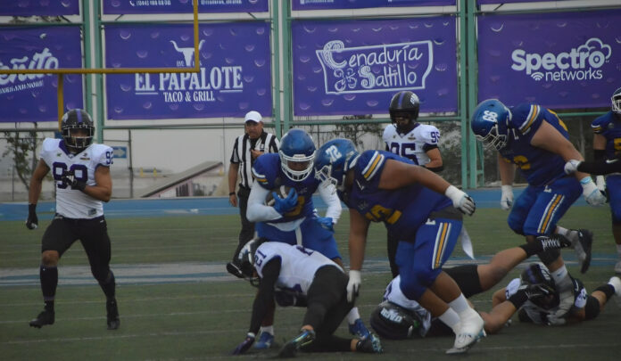 Chihuahua, Chih., a 6 de septiembre del 2025.- Las Águilas de la Universidad Autónoma de Chihuahua comenzó de forma positiva la temporada 2025 en la Conferencia Nacional de la ONEFA al imponerse este viernes por la noche en calidad de visitante a los Lobos de la Autónoma de Coahuila por un marcador de 28-20 en un partido cargado de intensidad en el estadio “Jorge Castro Medina” de la ciudad de Saltillo.