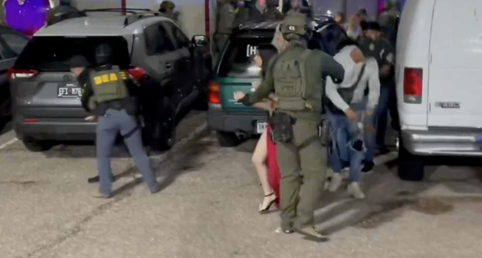 Un video publicado por la DEA en redes sociales muestra a agentes con equipo táctico destrozando la ventana de un edificio mientras decenas de personas salen por la puerta principal. Algunos intentan huir, pero agentes y oficiales armados les dicen a la multitud que se tiren al suelo.
