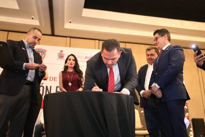 Chihuahua, Chih., a 2 de mayo del 2025.- “Es un honor asumir esta responsabilidad, en el ánimo de que sea un esfuerzo de unidad y de trabajo no partidista por Chihuahua”, dijo el Presidente Municipal de Juárez, Cruz Pérez Cuéllar, al tomar protesta como coordinador estatal de la Asociación de Autoridades Locales de México A. C. (AALMAC).
