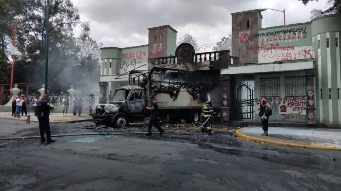 Ciudad de México., a 26 de septiembre del 2025.- A 11 años de la desaparición de los 43 estudiantes de Ayotzinapa, encapuchados se apoderaron de un camión de transporte y lo estrellaron contra instalaciones militares.
