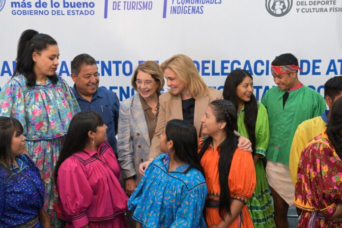Chihuahua, Chih., a 6 de agosto del 2025.- La gobernadora María Eugenia Campos Galván abanderó a la delegación compuesta por 18 atletas rarámuris provenientes de la Sierra Tarahumara que participarán en la cuarta edición de los Juegos Maestros Indígenas 2025 que se llevará a cabo en Ottawa, Canadá.