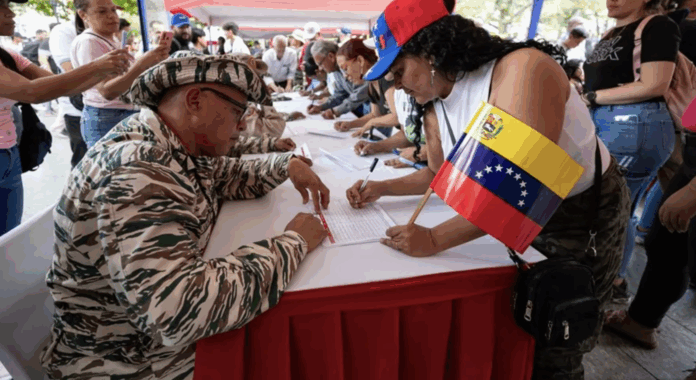 Ciudad de México., a 24 de agosto del 2025.- Simpatizantes del Gobierno de Venezuela se congregaron en varios puntos de Caracas para alistarse en la Milicia Nacional Bolivariana (MNB) e instaron a la población a sumarse a la jornada convocada durante todo el fin de semana por el presidente Nicolás Maduro, en respuesta al patrullaje de buques que planteó EE.UU. en el mar Caribe, cerca a las costas del país suramericano, para combatir el narcotráfico.