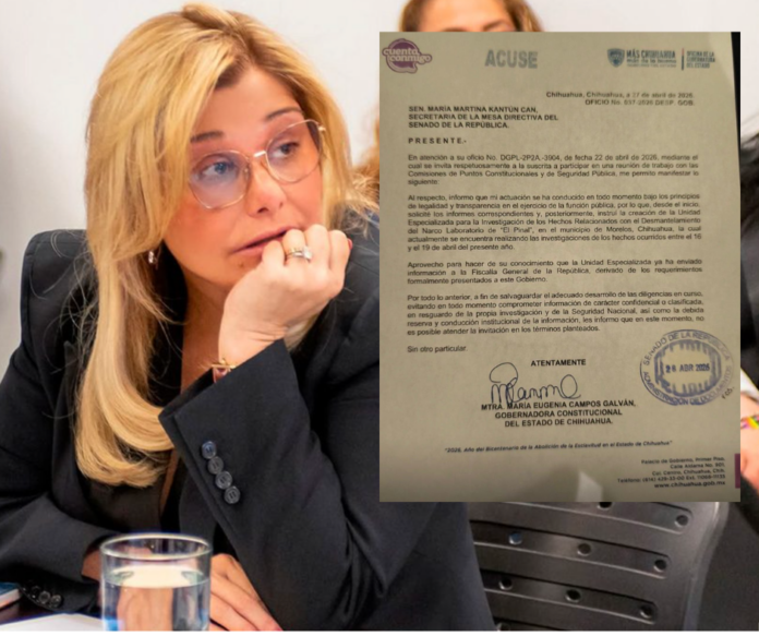 Chihuahua, Chih., a 28 de abril del 2026.- En un movimiento que escala la tensión entre el Estado y la Federación, la gobernadora María Eugenia Campos Galván notificó formalmente al Senado de la República su decisión de no comparecer ante las comisiones de Puntos Constitucionales y de Seguridad Pública. La reunión, programada para este martes, tenía como objetivo central esclarecer la participación de agentes estadounidenses en operativos de combate al narcotráfico en la Sierra Tarahumara.
