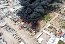 Chihuahua, Chih., a 26 de abril del 2026.- Una densa columna de humo negro cubrió el sur de la capital este domingo, tras registrarse un incendio de grandes proporciones en la empresa Procesadora y Recicladora de Materiales Industriales, en la colonia Sierra Azul al sur de la ciudad de Chihuahua.