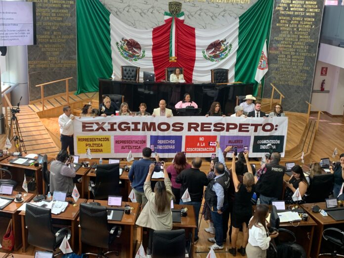 Los diputados de Morena se manifestaron frente al pleno con una lona en la que se leía: “Exigimos respeto”, “No a la discriminación”, “Representación política indígena”, “Representación auténtica”, “Derechos indígenas”, “Cosmovisión indígena” y “Mujeres indígenas”, esto mientras que la diputada Edith PalmaOntiveros, de representación proporcional, desde la tribuna, alzando la mano izquierda con la señal de la 4T, solicitó al pleno el voto a su favor en ralámuli y en español.