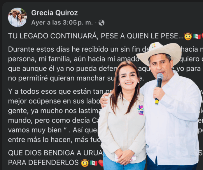 Uruapan, Mich., a 1 de diciembre del 2025.- La alcaldesa de Uruapan, Grecia Quiroz viuda de Manzo através de su cuenta de Facebook advirtió que a sus detractores que a pesar de las críticas, ataques y descalificaciones hacia ella y su difunto esposo, continuará con el legado de Carlos Manzo.