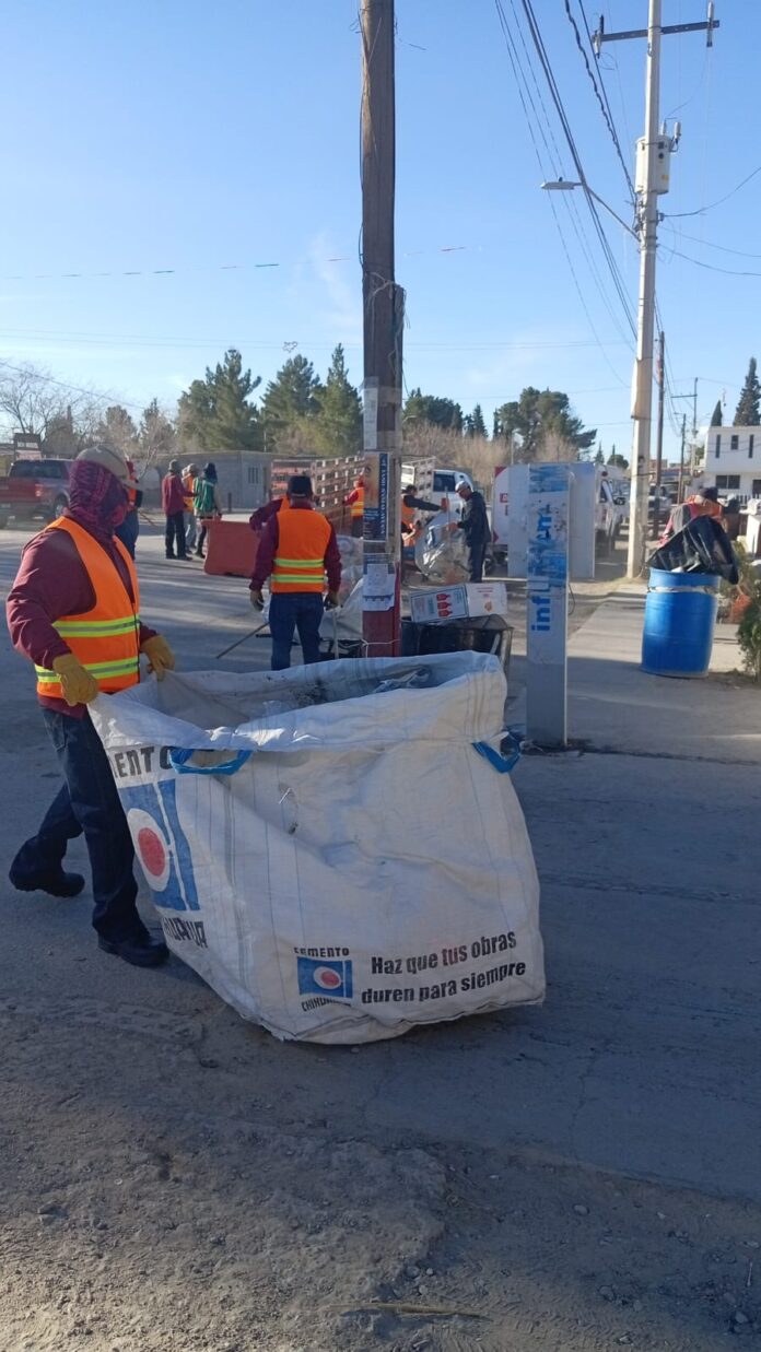 Ciudad Juárez, Chih., a 16 de febrero del 2026.- Las cuadrillas de la Dirección de Limpia llevan a cabo labores de limpieza en el ejido Samalayuca, luego de los festejos realizados en la comunidad el fin de semana, los cuales generaron acumulación de residuos.